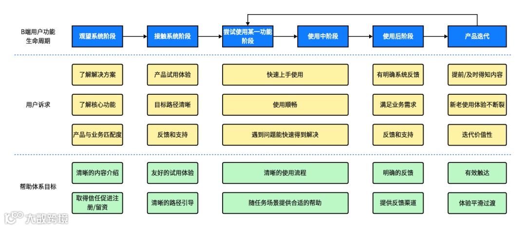 我们将B端用户功能生命周期切分为观望系统阶段、接触系统阶段、尝试使用某一功能阶段、使用中阶段、使用后阶段,以及产品迭代阶段。