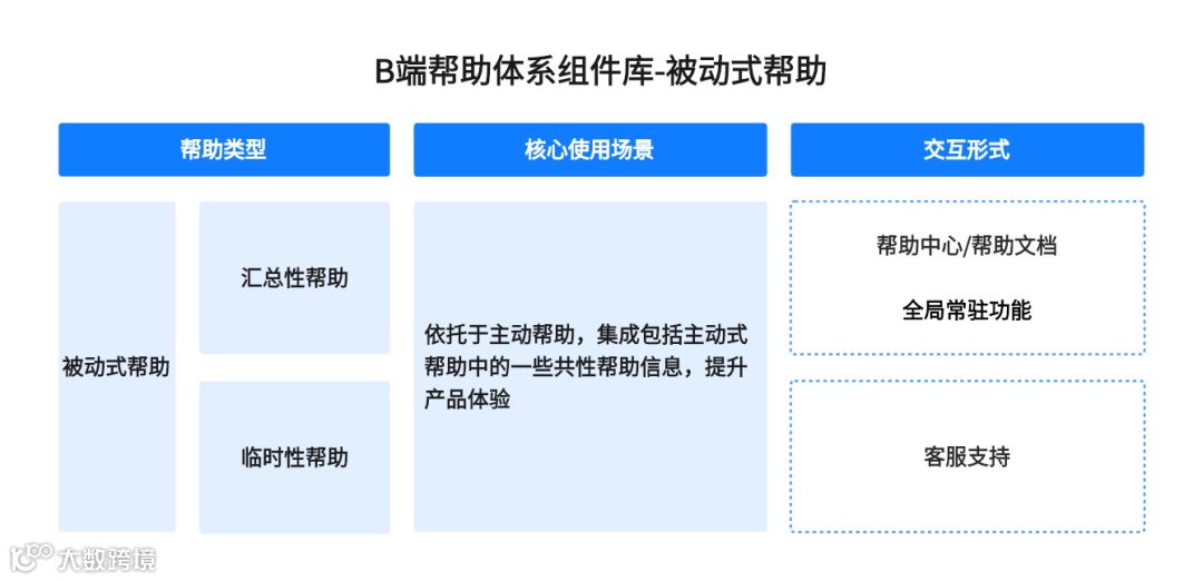 核心使用场景是依托于主动帮助,集成包括主动式帮助中的一些共性帮助信息,提升产品体验。被动式帮助可以分为两种类型:汇总性帮助和临时性帮助。