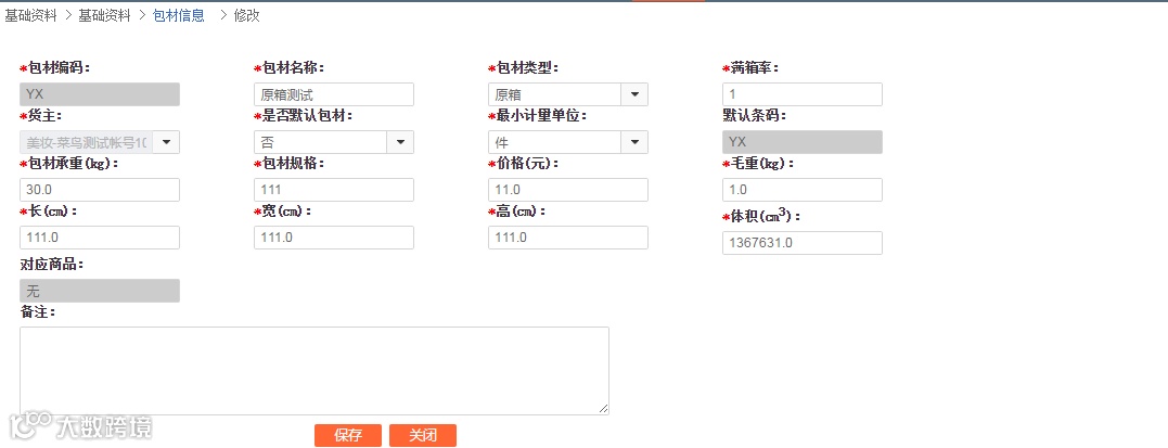 包材本质上也是一种商品,可以放在商品信息中进行维护,在类型字段中新增“包材”进行区分,也可以单独进行维护,大宝WMS就是单独进行信息的维护,如下(仅供参考):