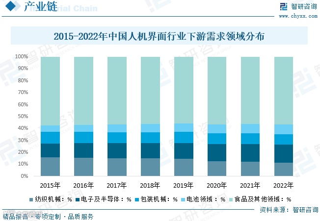 人机界面产业链上游主要包括面板制造等硬件及工业软件行业,下游广泛应用于工业自动化领域,涵盖纺织机械、半导体、包装机械、电池、食品等行业。