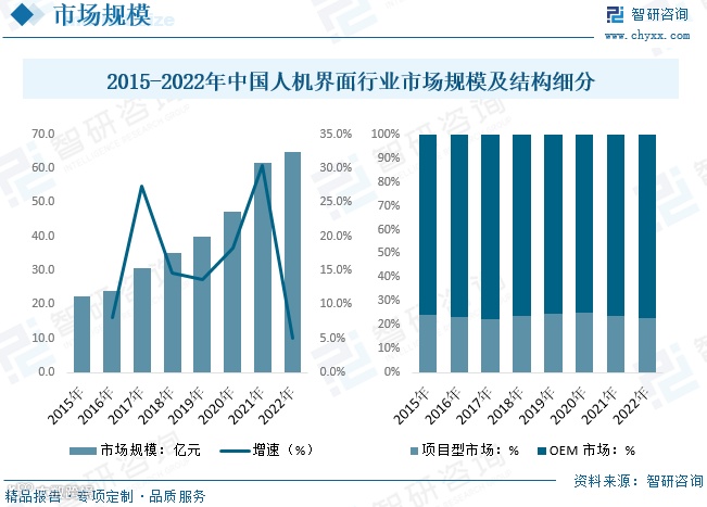 随着硬件技术进步以及计算机图形学、软件工程和窗口系统的发展,图形界面已成为主流人机交互方式,广泛应用在Macintosh、Windows、X2Window等商用系统中。2022年,中国人机界面行业市场规模达64.8亿元,同比增长5.0%。