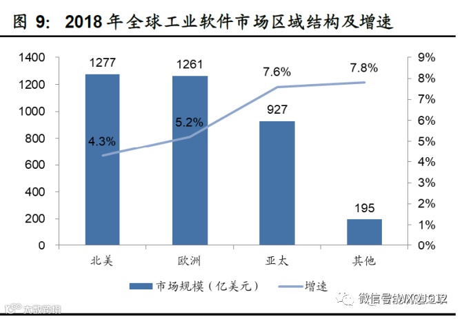 根据赛迪顾问数据,2018年全球工业软件市场规模达3893亿美元,同比增长5.19%。北美与欧洲合计占65.2%,亚太地区增速达7.6%,成为增长主力。