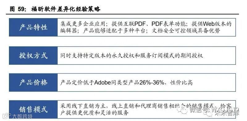 福昕软件通过产品功能差异化(如互联PDF、RMS集成)、灵活授权模式、价格优势(比Adobe低26%-36%)和直销服务,在竞争中突围。