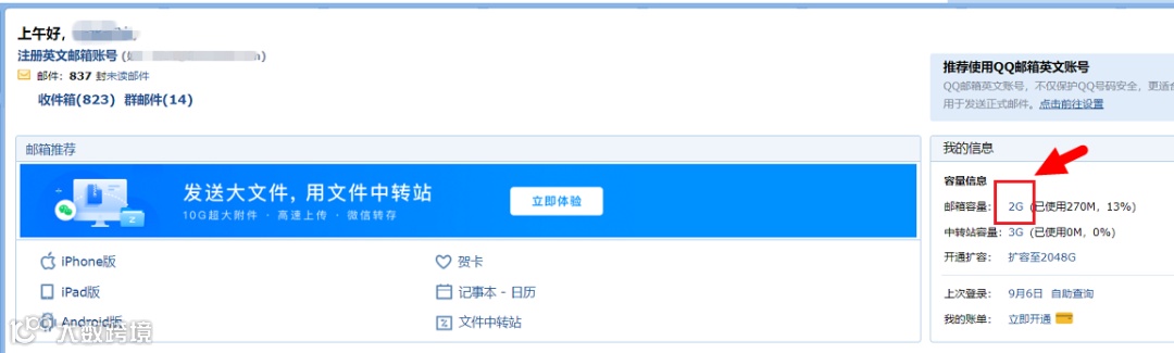 首先,打开QQ邮箱网页版首页,点击右侧的蓝色字体“2G”,这里就是QQ邮箱的默认空间,如果你之前升级过可能是4G、6G......