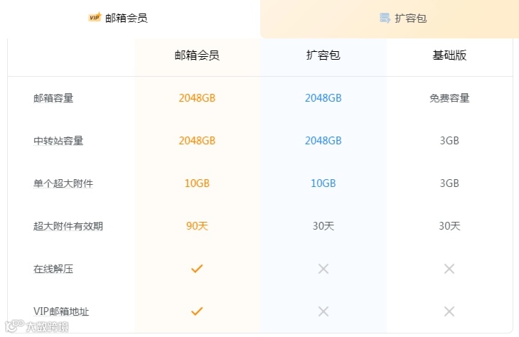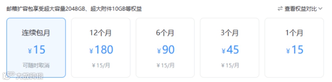 此外,用户也可以开通单独的扩容包,资费方面为 15 元/月,180 元/年,扩容包的超大附件有效期只有30天,也不支持在线解压等服务,详细情况大家可查看相对应权益。