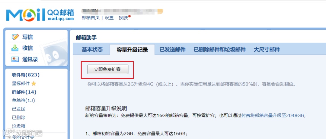 接着点击“立即免费扩容”就可以进行扩容了,免费容量最大可达16GB,日常工作收发邮件对于大部分小伙伴也够用了。