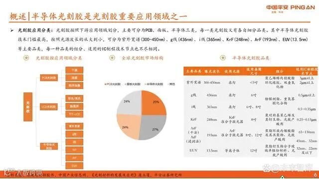 按应用领域划分,光刻胶可分为PCB、面板和半导体三大类,其中半导体光刻胶技术门槛最高。根据光源波长不同,半导体光刻胶主要包括紫外宽谱(300-450nm)、g线(436nm)、i线(365nm)、KrF(248nm)、ArF(193nm)以及EUV(13.5nm)等类型,对应不同的IC制程节点。