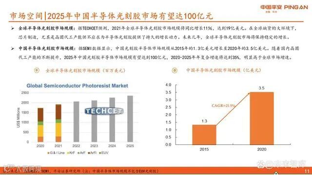 TECHCET预测,2021年全球半导体光刻胶市场规模达19亿美元,同比增长11%。受芯片缺货影响,晶圆代工产能紧张,带动光刻胶需求持续增长。SEMI数据显示,中国半导体光刻胶市场规模从2015年的1.3亿美元增至2020年的3.5亿美元,预计2025年将突破100亿元人民币,2020-2025年复合增速高达35%,显著高于全球平均水平。