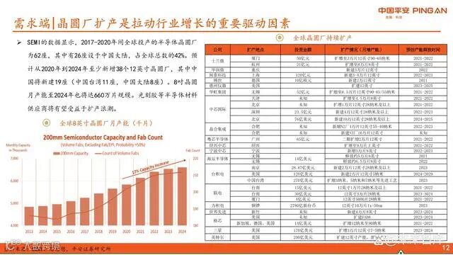 SEMI统计显示,2017-2020年全球新建62座晶圆厂,其中26座位于中国大陆,占比42%。2020-2024年预计将新增至少38座12英寸晶圆厂,中国大陆占8座,中国台湾11座。此外,8英寸晶圆月产能预计2024年达到660万片。晶圆制造扩张直接拉动光刻胶等关键材料需求。