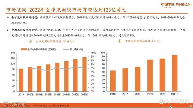 据前瞻产业研究院数据,2019年全球光刻胶市场规模为82亿美元,预计2026年将达到123亿美元,复合年增长率约6%。中国光刻胶市场受益于PCB、LCD及半导体制造产能东移,规模从2016年的53.2亿元增至2020年的84亿元,2021年达93.3亿元,同比增长11%。
