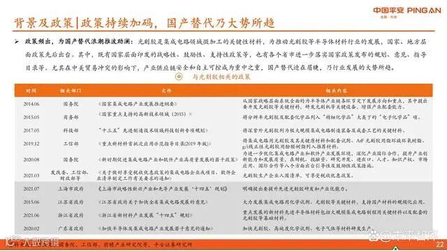 光刻胶作为集成电路微加工的关键材料,近年来受到国家高度重视。中央及地方政府陆续出台多项鼓励、支持类政策,强化产业链安全与自主可控。特别是在中美贸易摩擦背景下,核心材料国产化已成为战略刚需,政策红利持续释放,助力本土企业发展。