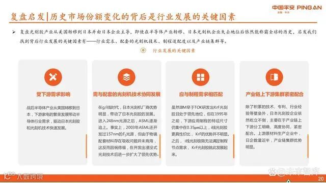回顾光刻胶产业从美国向日本转移并由日本企业长期主导的历史可见,市场需求、光刻机技术协同、制程适配性以及产业链集群效应是决定行业格局的核心因素。即便日本失去光刻机领先地位,其光刻胶企业仍凭借深厚积累维持全球统治地位。