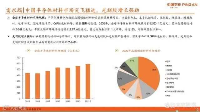 半导体材料分为晶圆制造材料和封装材料,前者占主导地位,主要包括硅片、光刻胶、电子特气、湿化学品等。2020年全球半导体材料市场规模达553.1亿美元,其中晶圆制造材料为349亿美元。中国大陆市场规模达97.6亿美元,首次成为全球第二大市场,增速达12%,居全球首位。