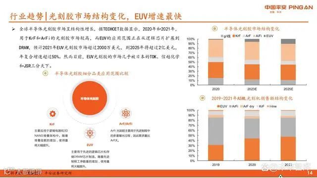 全球半导体光刻胶市场呈现结构性增长特征。TECHCET数据显示,KrF与ArFi光刻胶仍为主流,但EUV应用正从逻辑芯片扩展至DRAM领域。预计2021年EUV光刻胶市场规模超2000万美元,2025年将突破2亿美元,复合年增长率超过50%。目前该市场几乎由日本TOK、信越化学和JSR三家垄断。