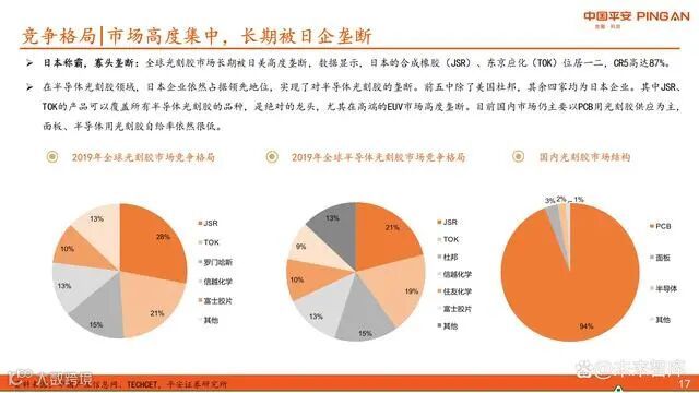 全球光刻胶市场长期由日美企业主导,CR5高达87%。JSR和东京应化(TOK)位列前两位,其余前三甲包括信越化学、富士胶片和美国杜邦。在半导体光刻胶领域,日本企业全面领先,尤其在EUV等高端品类中形成绝对垄断。国内目前仍以PCB用光刻胶为主,面板和半导体用产品自给率极低。