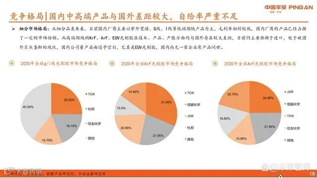 国内厂商主要集中于紫外宽谱、g线、i线等低端光刻胶领域,已具备一定市场份额,但毛利率较低。而在KrF、ArF及EUV等高端产品方面,无论技术、量产能力还是客户认证均与国外存在巨大差距,基本依赖进口。特别是EUV光刻胶,国内尚无企业实现产品落地。