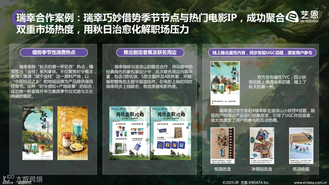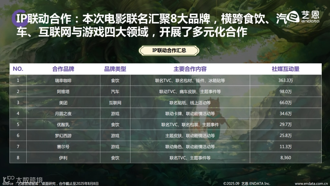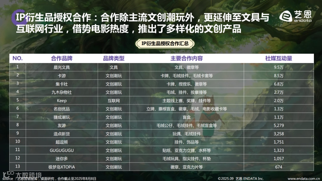 《浪浪山小妖怪》在上映前即展现出强劲商业潜力,IP授权与衍生开发同步推进。截至目前,已与阿维塔、伊利、优酸乳、瑞幸、卡游等超30家知名品牌达成合作,覆盖汽车出行、餐饮茶饮、图书出版、卡牌潮玩、互联网平台、便利店及主题餐厅等多个领域。其中,17家为实体衍生品企业,随电影同步推出的授权单品超过400款,形成完整的产业链布局。