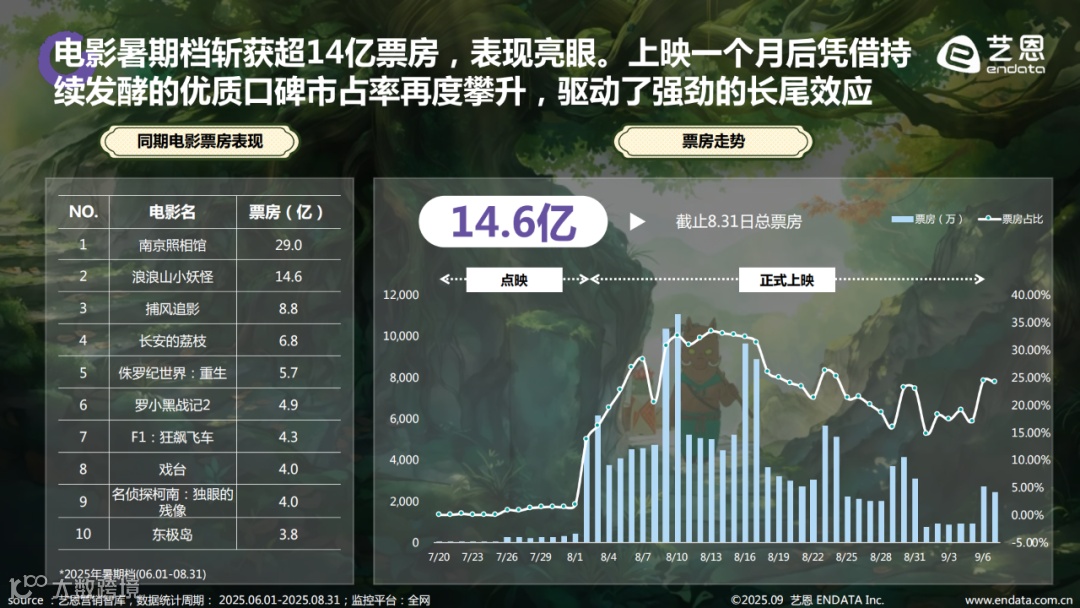 2025年暑期档,动画电影《浪浪山小妖怪》以14.6亿元票房成绩异军突起,成为档期最大黑马。影片延续爆款短片集《中国奇谭》中《小妖怪的夏天》的创作脉络,聚焦“小人物觉醒”主题,凭借对现实生活的精准刻画和极具质感的视觉呈现,引发观众强烈共鸣,收获良好口碑。
