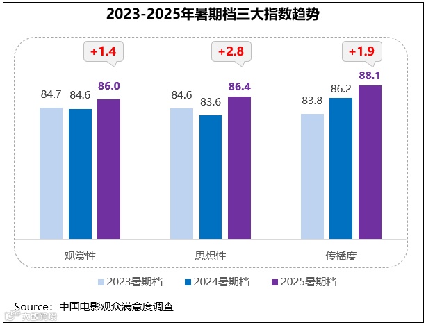 2025年暑期档整体创作水平提升,观赏性得分86.0分、思想性86.4分、传播度88.1分,分别同比增长1.4分、2.8分和1.9分。三大指数均位列历史同期前三,成为唯一三项均超86分的暑期档。