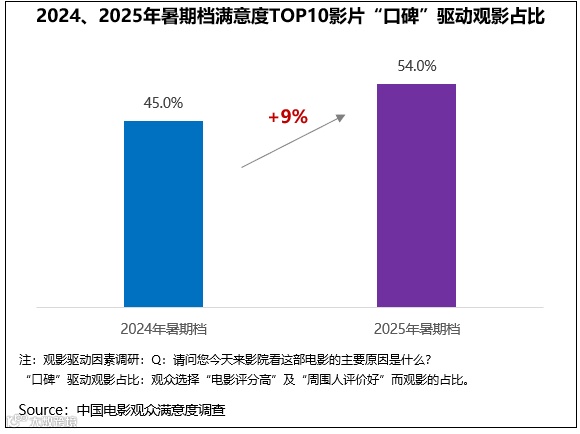 调研显示,因“口碑好”(包括“评分高”“他人推荐”)而选择观影的比例达54.0%,较2024年同期上升9个百分点;其中《南京照相馆》高达62%。