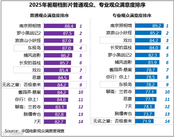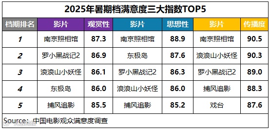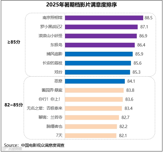 2025年暑期档电影观众满意度得分为86.5分,较去年同期上升1.9分。所有重点调查影片满意度均超过82分,其中《南京照相馆》《罗小黑战记2》《浪浪山小妖怪》《东极岛》《捕风追影》《长安的荔枝》《戏台》等7部影片满意度突破85分,为历次档期之最。高质量内容矩阵推动口碑与市场双升温,档期呈现多元化精品创作态势。