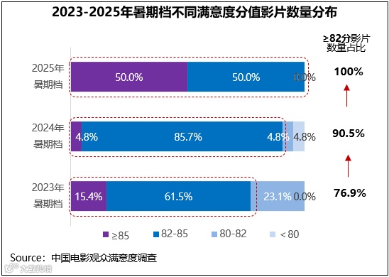 本档期14部重点影片满意度全部超过82分,其中7部突破85分,远超2023年(2部)和2024年(1部),创下历史新高。