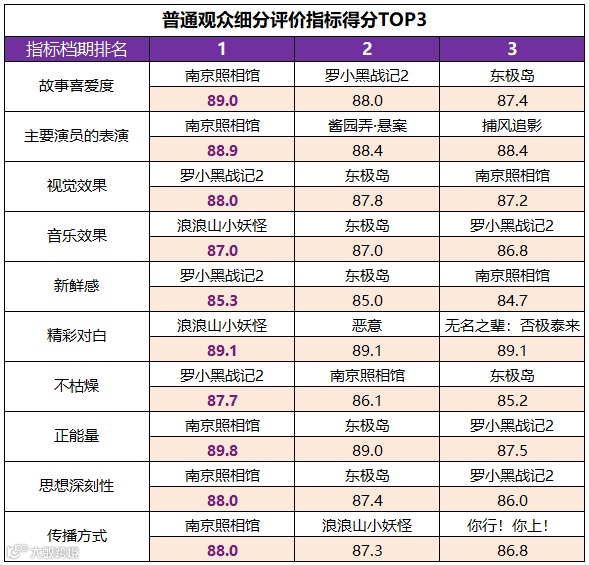 从细分维度看,普通观众认为《南京照相馆》在故事喜爱度、演员表演、正能量、思想深度及传播方式五项指标居首;《罗小黑战记2》在视觉效果、新鲜感、趣味性方面领先;《浪浪山小妖怪》音乐效果最佳。此外,《酱园弄・悬案》《捕风追影》的演员表现、《东极岛》的故事吸引力、《恶意》的对白设计均进入前三。