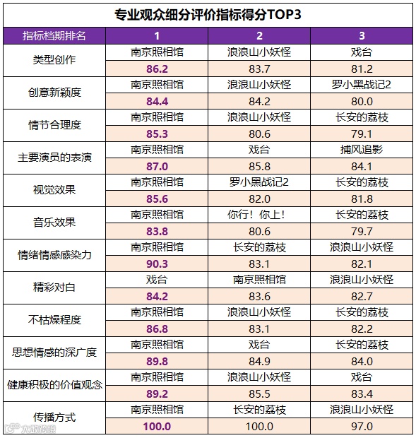 专业观众评价中,《南京照相馆》在12项指标中有11项排名第一,尤其在演员表演、思想深度、价值导向等方面表现突出;《戏台》精彩对白得分最高。其他亮点还包括:《浪浪山小妖怪》创意新颖度、《罗小黑战记2》视觉效果、《你行!你上!》音乐效果、《长安的荔枝》情感感染力、《捕风追影》演员表现等均位列前三。