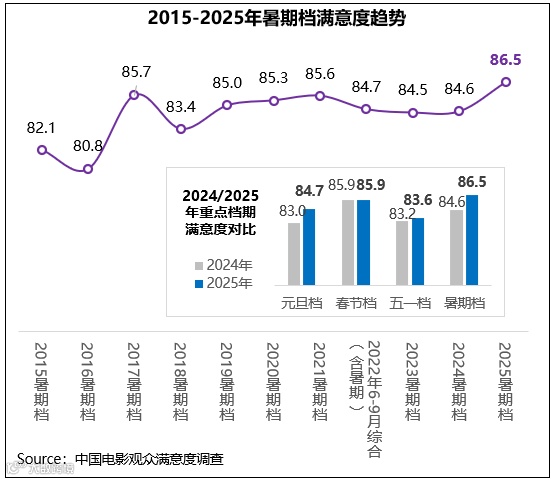 中国电影观众满意度调查·2025年暑期档结果显示,暑期档观众满意度达86.5分,同比提升1.9分。7部影片满意度超85分,数量创历年各档期新高。《南京照相馆》《罗小黑战记2》《浪浪山小妖怪》等影片表现突出,历史战争、动画、动作等多元类型齐头并进,形成“内容为王”的精品化格局。