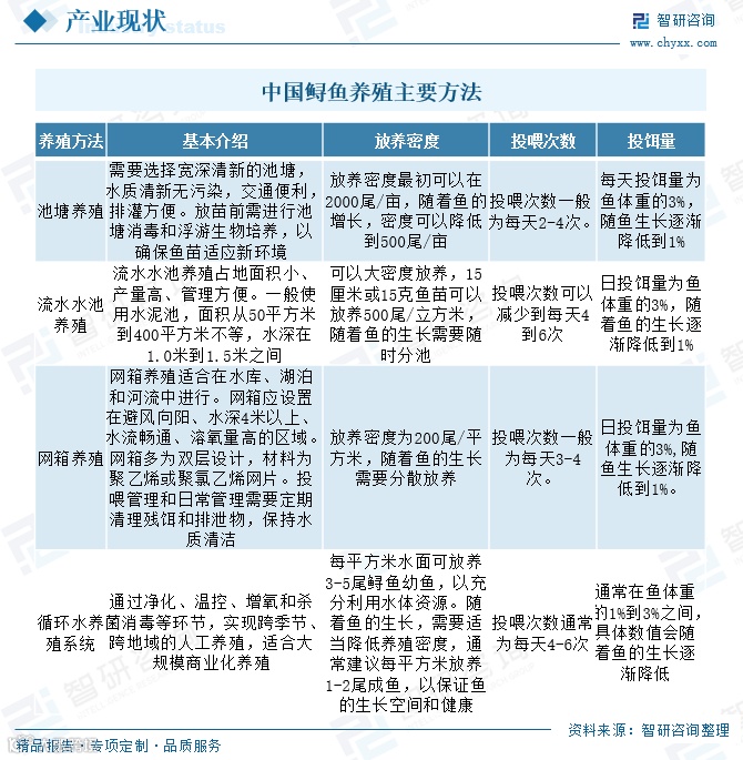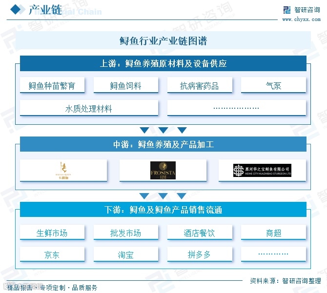 鲟鱼产业链上游涵盖种苗繁育、饲料生产、病害防控及养殖设备供应;中游以池塘、流水池、网箱和循环水系统等方式开展养殖,并进行鱼子酱、鱼肉制品、保健品、皮革等深加工;下游通过生鲜市场、商超、餐饮、电商平台等渠道销往终端消费者,形成完整产业闭环。