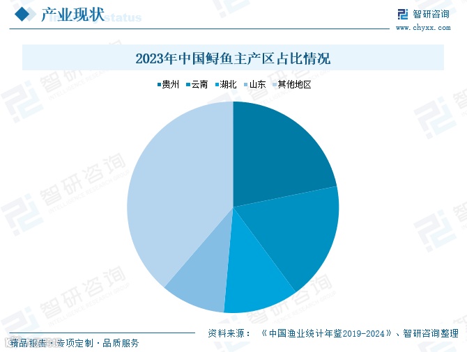 目前我国已成为全球最大鲟鱼养殖国,产量从2003年的1.09万吨增至2023年的14.94万吨,占全球养殖总量85%以上,贡献全球鱼子酱贸易超40%。2024年产量突破15万吨。区域集中度高,主产区为贵州、云南、湖北、山东、河北、四川等地。其中云贵地区凭借优质冷水资源占据全国产量40%。2023年,贵州(3.25万吨)、云南(2.70万吨)、湖北(1.71万吨)、山东(1.48万吨)四省合计占比达61%,贵州跃居首位,湖北增速高达72.5%。