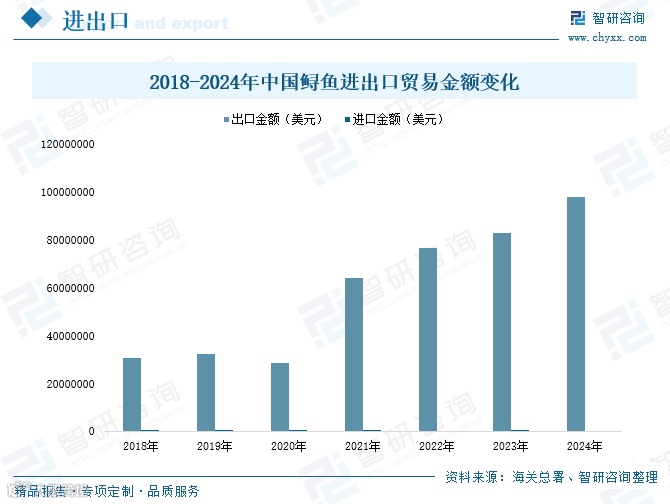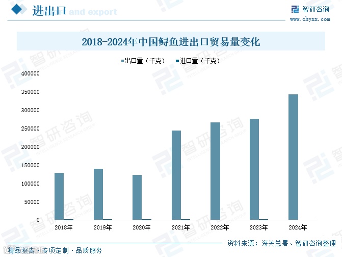 国内鲟鱼产能充足,基本实现自给自足,出口稳步增长,进口趋于微小。2024年,我国鲟鱼出口总量达34.24万千克,同比增长24.14%;出口总额9803.57万美元,同比增长18.5%。进口量可忽略不计。出口市场覆盖42个国家,集中度较高,对美国、德国、比利时、法国、日本五国出口占比达68.53%,其中比利时跻身前三,成为重要贸易伙伴。