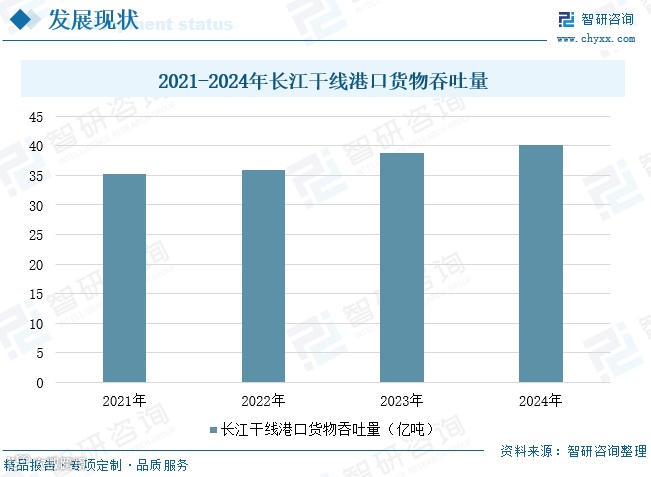 长江干线货运量持续攀升:1950年代年吞吐量仅400万吨,1980年代突破1亿吨,2007年超10亿吨,2019年达30亿吨,2024年达40.2亿吨,同比增长3.9%。增长动力主要来自三方面:一是国家持续投入交通基础设施,推动港口智能化升级;二是长江经济带制造业与电商物流活跃,运输需求旺盛;三是国际贸易回暖带动货流增长。