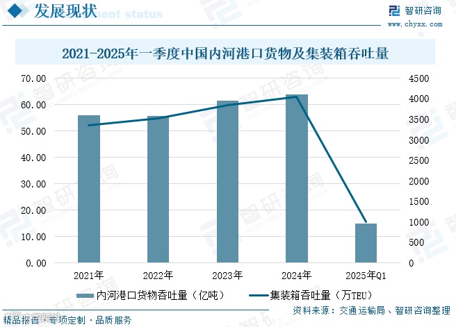 近年来,宏观经济回升向好,有效支撑港口吞吐量增长。2024年全国内河港口完成货物吞吐量63.77亿吨,同比增长3.9%;集装箱吞吐量达4040万标箱,同比增长5.2%,行业发展态势稳健。
