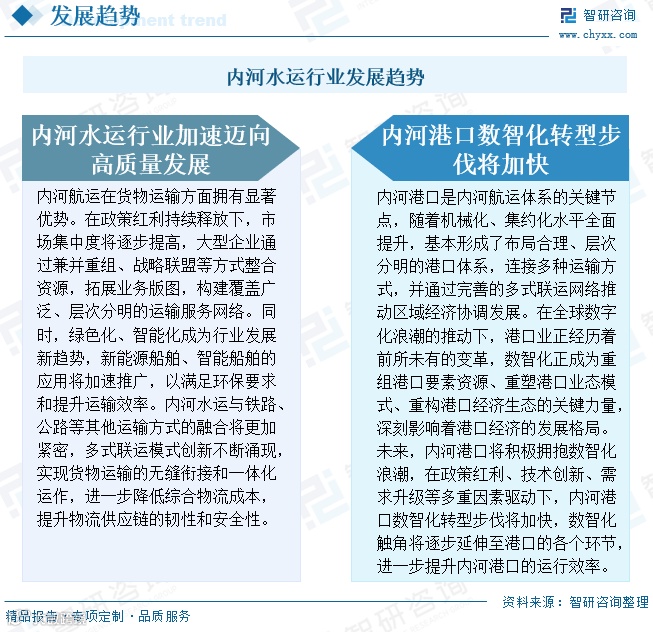在政策持续支持下,内河水运行业将加快资源整合,市场集中度提升,大型企业通过兼并重组、战略联盟等方式拓展业务,构建多层次、广覆盖的服务网络。绿色化、智能化成为主流趋势,新能源船舶、智能船舶应用将加速普及,满足环保要求并提升效率。同时,内河水运与铁路、公路等运输方式深度融合,多式联运模式不断创新,推动货物运输无缝衔接与一体化运作,降低综合物流成本,增强供应链韧性。