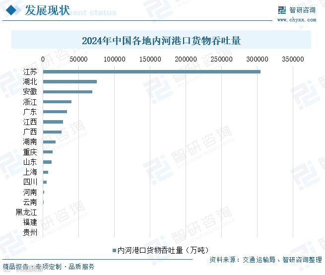 从区域看,江苏省内河港口货物吞吐量居全国首位,达30亿吨以上,同比增长2.1%;集装箱吞吐量2027万标箱,增长9.0%。湖北、安徽分别以7.53亿吨、6.94亿吨位列第二、第三。浙江、广东、江西、广西、湖南、重庆、山东等地吞吐量均超亿吨。江苏水域面积占全省17%,三级及以上内河航道超2600公里,基本形成“联网通畅、达江通海”的航道体系。
