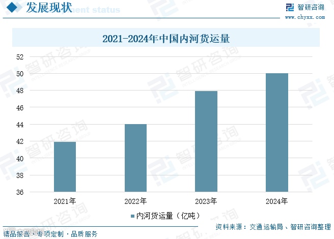 作为全球第一制造业大国和物流大国,我国内河航运体系不断完善。党的十八大以来,内河航运发展水平显著提升,货运量连续多年位居世界第一。2024年完成内河货运量约50亿吨,较“十三五”末增长31.6%。