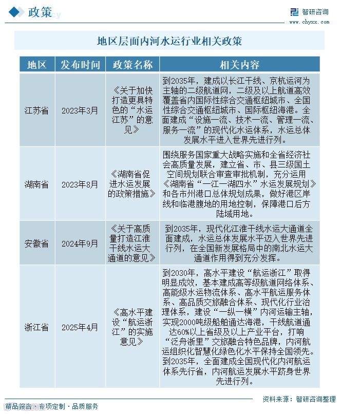 地方层面,江苏、浙江、湖南等地也相继出台支持政策。2023年3月,江苏省发布《关于加快打造更具特色的“水运江苏”的意见》,着力发挥水运优势,加快建设交通强省。2025年5月,浙江省出台《高水平建设航运浙江实施意见》,提出到2030年基本建成高等级航道网络、高能级水运物流体系、高品质交旅融合体系,实现2000吨级船舶通达海港,干线航道覆盖60%以上省级及以上产业平台,打响“泛舟浙里”品牌;到2035年全面建成全国现代化内河航运体系先行省,发展水平跻身世界前列。