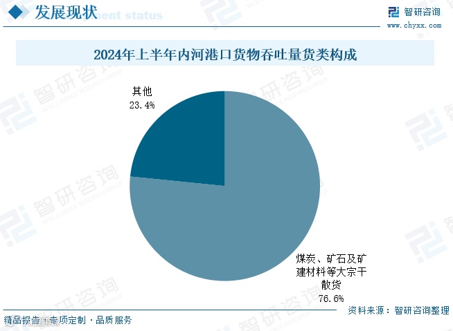当前内河航运主要服务三大领域:一是大宗散货,煤炭、矿石、矿建材料等占比超70%,2024年上半年达76.6%;二是沿江布局的制造业,如汽车、装备制造依赖集装箱运输;三是新能源设备、生物质能源等新兴货类占比逐步提升。