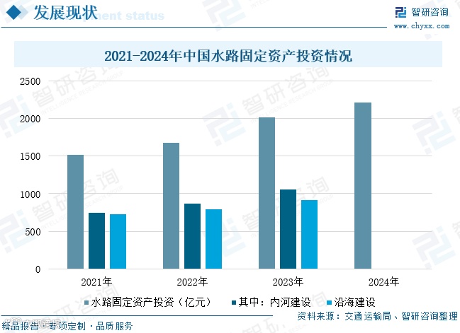 “十四五”以来,我国水上运输进入攻坚短板、深化改革、创新驱动的关键阶段,加快推进内河水运与港口集疏运体系建设,加快绿色低碳转型,完善多式联运机制。受益于国家战略和区域协调发展需求,水运投资持续增长。2023年水路固定资产投资达2016亿元,同比增长20.1%,其中内河建设完成1052亿元,增长21.3%。2024年水路投资达2208亿元,同比增长9.5%。