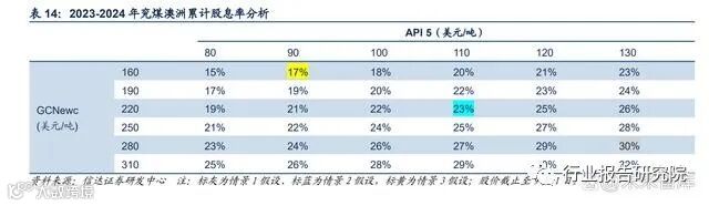 2023年预计归母净利润约14亿澳元。按50%分红率测算,2023年股息率达10.4%。展望2024年,在三种煤价情景下,归母净利润预计为8.7亿至26.4亿澳元,对应股息率6%–20%。公司处于净现金状态,资本开支低,具备提升分红潜力。