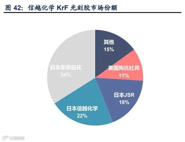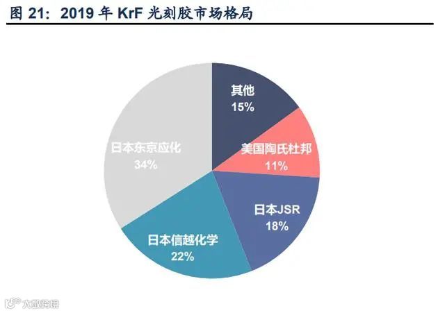 细分领域来看,g/i线市场除日企外,韩国东进世美肯、美国杜邦分别占12%、18%;KrF市场非日系仅杜邦占11%;ArF市场杜邦份额降至4%,基本被日企垄断;EUV光刻胶则由JSR与信越化学两家主导。