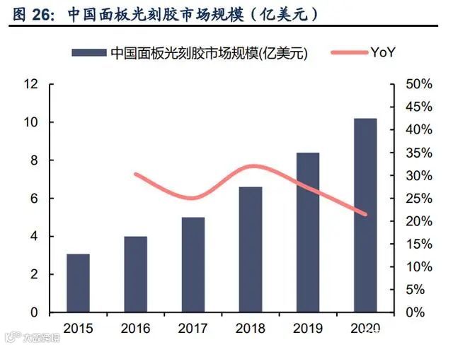 近年来,全球显示产业链向中国转移,京东方、华星光电、惠科等已成为全球主流面板供应商。中国主导的产能扩张带动面板光刻胶需求快速增长。2015–2020年,国内面板光刻胶市场规模从3.07亿美元增至10.2亿美元,年均复合增速达27.14%。
