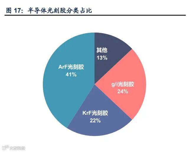 KrF光刻胶占比22%,适用于250–150nm制程;g/i线光刻胶占比24%,用于350nm以上成熟工艺。EUV光刻胶面向7nm及以下先进节点,尚处早期应用阶段,未来潜力巨大。