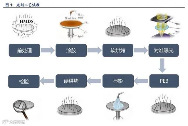 光刻工艺是半导体制造的核心流程,涵盖前处理、涂胶、曝光、显影、刻蚀等环节,通过将掩模版上的图形转移至基片,实现微细结构的加工。光刻胶作为该过程的关键材料,是一种由溶剂、光引发剂和成膜树脂组成的光化学敏感性混合液体,广泛应用于微电子器件制造,是我国重点发展的电子化学品之一。