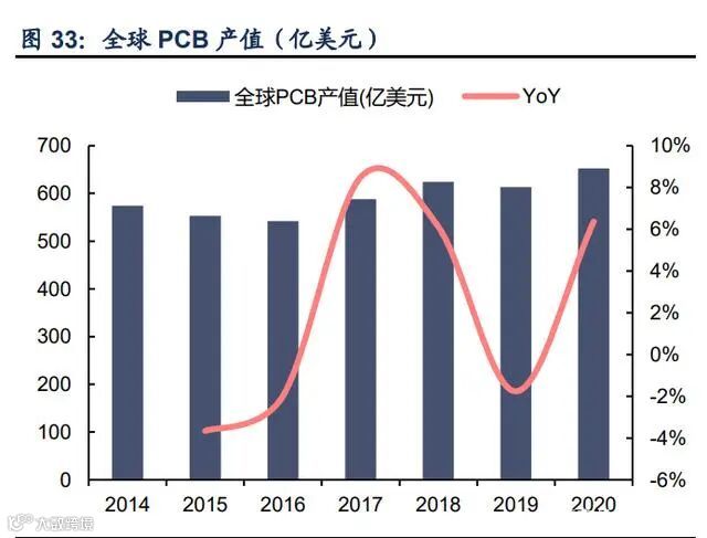 受益于劳动力与资源成本优势,21世纪以来PCB产业向中国转移。2019年全球PCB产值约637亿美元,中国达329.4亿美元,占比超50%,为全球最大生产国。预计2021年产值将达370.5亿美元。