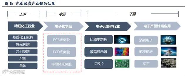 光刻胶位于电子产业链核心位置,上游为精细化工,下游涵盖半导体、PCB、显示面板等。随着半导体制程进入纳米级,光刻胶成为产业链自主可控的关键环节。
