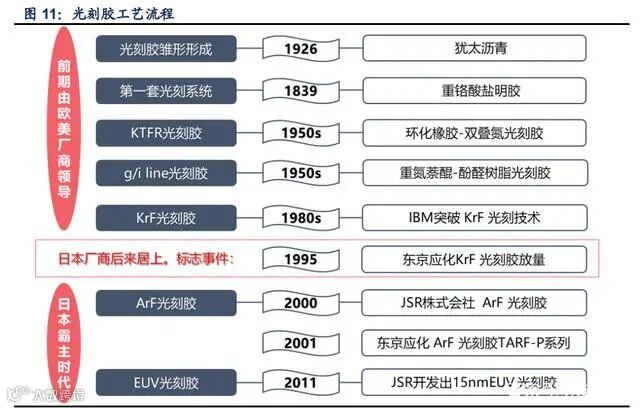 光刻胶产业起源于欧美,1950年代德国Kalle公司开发出g/i线用重氮萘醌型光刻胶。1980年代IBM实现KrF光刻胶自研突破。1995年东京应化率先推出商业化KrF正胶,标志日本主导时代的开启。