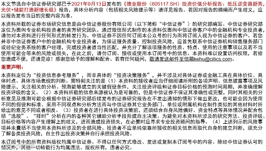 公司立足家电主业稳健发展,以高速成长的逆变器业务为驱动,盈利能力持续提升。预计2021-2023年归母净利润分别为5.1亿元、8.2亿元、11.9亿元,对应EPS分别为2.98元、4.81元、6.98元,三年复合增长率约46%,现价对应PE为65/41/28倍。
