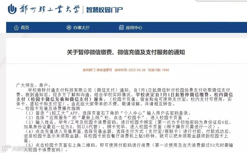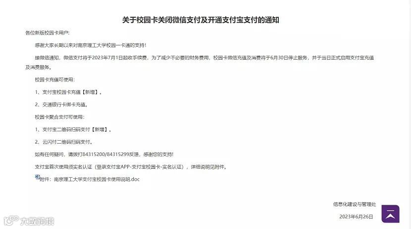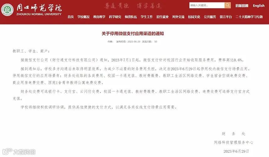 西北大学发布的公告显示,“因腾讯公司微信支付将于7月1日起对校园场景用户进行精细化管理,除收学费外,其它收费均会受到限制并收取0.6%的手续费。为维护师生利益,从6月30日起对校内一卡通用户暂停提供微信扫码支付服务,一卡通校园卡、交通银行App、云闪付、支付宝等渠道正常使用,望各位师生周知。”